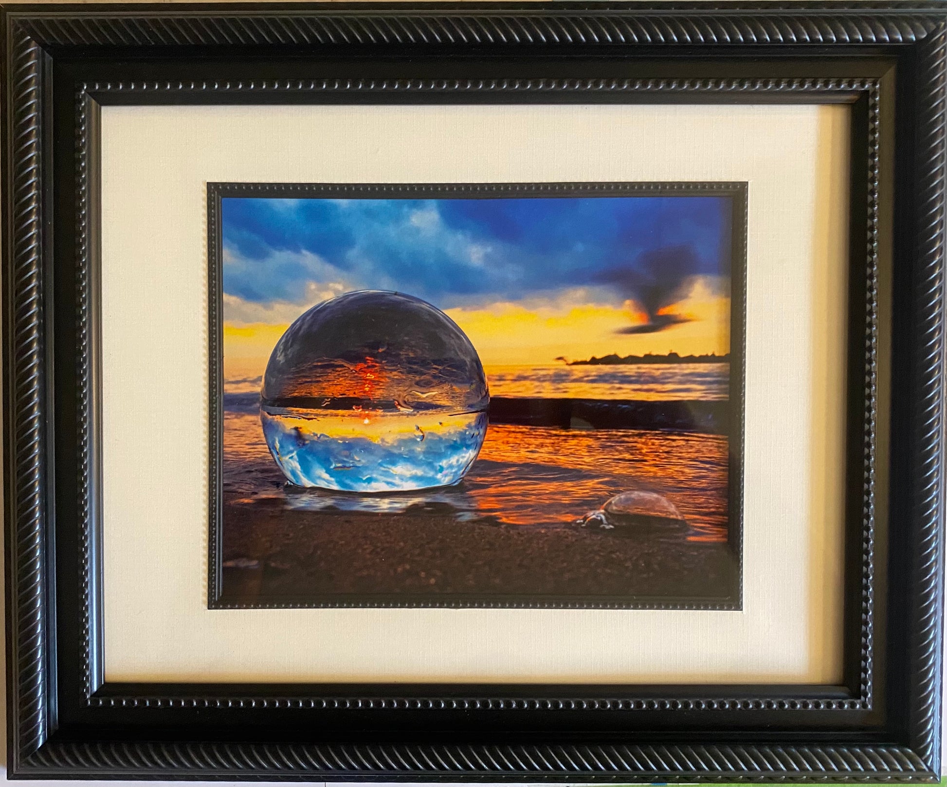 With clouds stirring, a wave retreats from the Lake Erie beach, forming a bubble on the sand. Our crystal ball rests within this calm scene, capturing the beautiful Presque Isle sunset and horizon line.