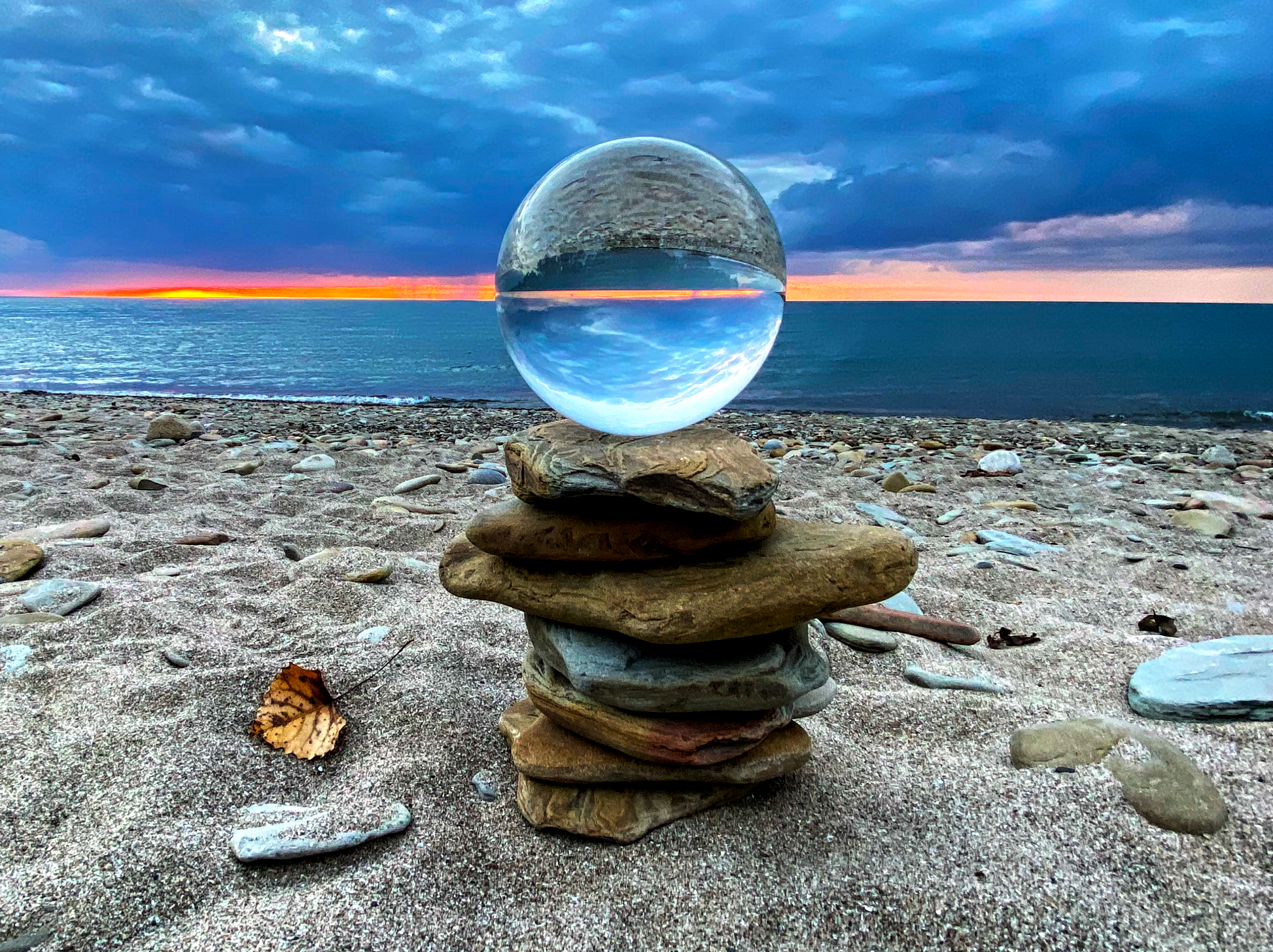 Our crystal ball rests upon a carefully balanced cairn, capturing the beautiful Presque Isle sunset and horizon line.